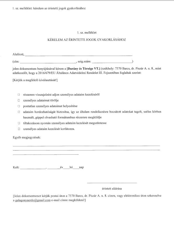 1. sz. Melléklet: Kérelem az érintett jogok gyakorlásához.